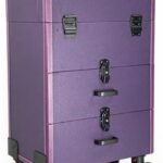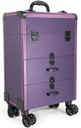 大型のローリングメイクアップケースで、プロ用に設計された鍵付きのトロリー型収納ケース。大容量で、引き出しやキャスター付き。ネイル用品や美容道具をしっかり整理できます。パープルカラー。