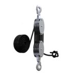HELIXロープホイストは、使用荷重300kgで、標準揚程2.5m、破談荷重2000kg、ロープ長20mの高耐久設計。ロープ径9.5mm、吊り上げ比8:1のポリエチレンロープを使用。
