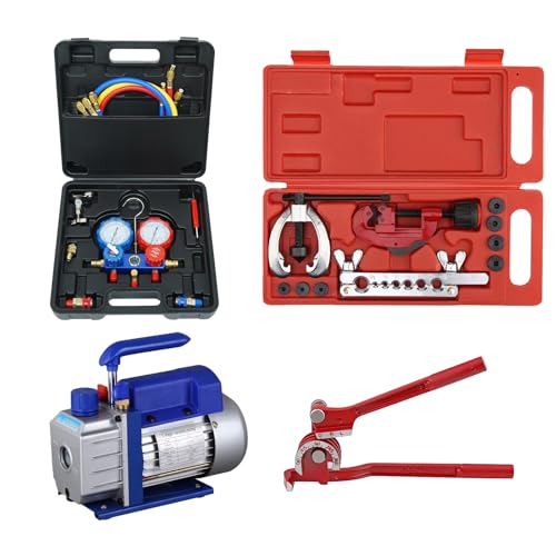 Fkstyleエアコン修理4点セットは、電動真空ポンプ、パイプベンダー、ダブルフレアリングツール、マニホールドゲージを含み、排気速度60LでR22/R134a/R404A/R410Aに対応します。角型ケース付きで収納も便利です。