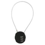ダイヤル式南京錠、ワイヤー30cm、丸型、3桁ロック。紛失防止に最適な可変式ダイヤルロック。簡単操作で小型、長いワイヤーが特徴。カラーは黒。