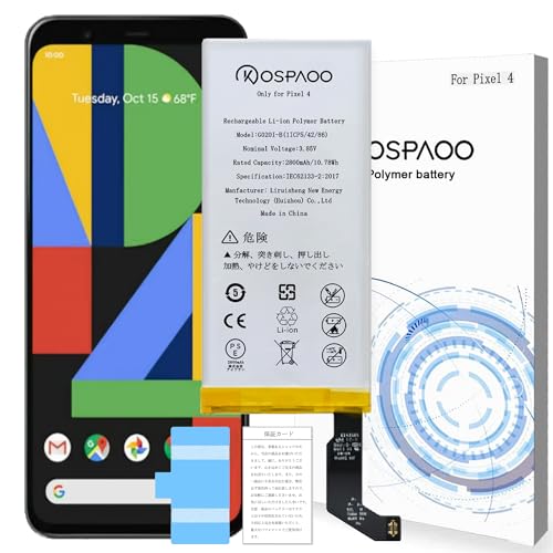 KOSPAOOのGoogle Pixel 4用バッテリーは、2800mAh、3.85Vのリチウムポリマー電池。PSE認証済みで、600~800回の充電サイクルを持ち、高温・低温に強い互換品です。