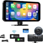 ポータブルディスプレイオーディオ。Carplay & Android Auto対応。6.25インチタッチパネル、WiFi搭載。ダッシュボード取り付け簡単。ドライブレコーダー、ミラーリング機能、64GBメモリカード付属。