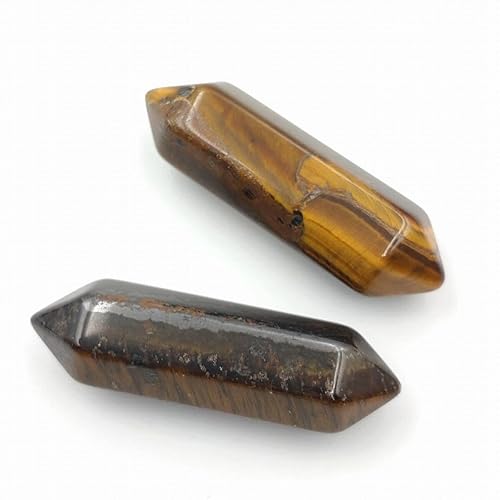 タイガーアイのポイント型天然石2個入り。浄化や魔除けに最適な六角柱デザインで、穴なしタイプ。開運浄化アイテムとしてアクセサリーパーツやビーズクラブで人気。