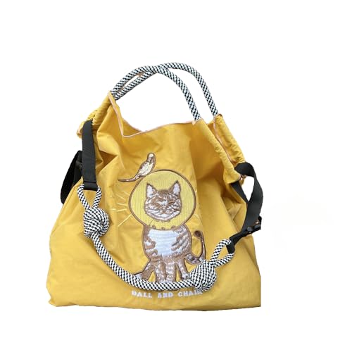 Richhapy ボールアンドチェーンエコバッグは、ショルダーストラップ1本付きの大容量折りたたみトートバッグ。軽量でオシャレなデザイン、コンパクトに収納可能。ナイロン製で繰り返し使用でき、刺繍デザインが魅力。サイズはM、色は黄色に猫の柄。