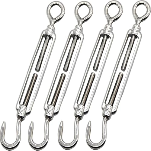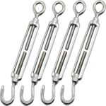 fogmanのターンバックルは、ステンレス製で耐久性が高く、ワイヤーフック付き。固定金具としてワイヤーロープに最適な4本セット(M5、1フック1ループ)です。屋外での使用にも適しています。