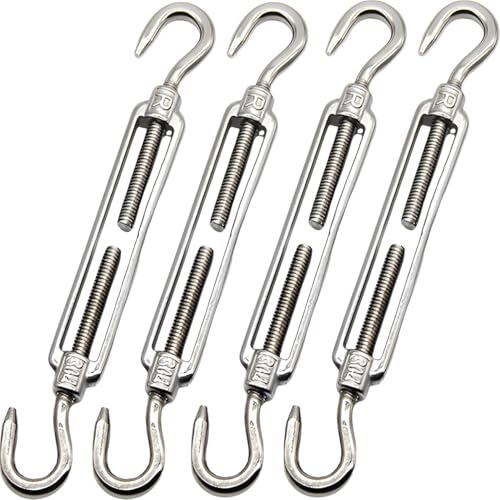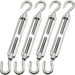 fogmanのターンバックルは、ステンレス製で高耐久。ワイヤーフック付きの固定金具で、ワイヤーロープ4本セット(M4 2頭フック)として利用可能。屋外用途にも最適です。