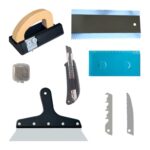 クッションフロアやカーペットの施工に最適なCFカッターセット。床用カッター、丈夫な刃物具6点が含まれ、床貼りや接着工事をスムーズに行える便利な工具です。