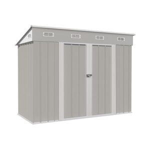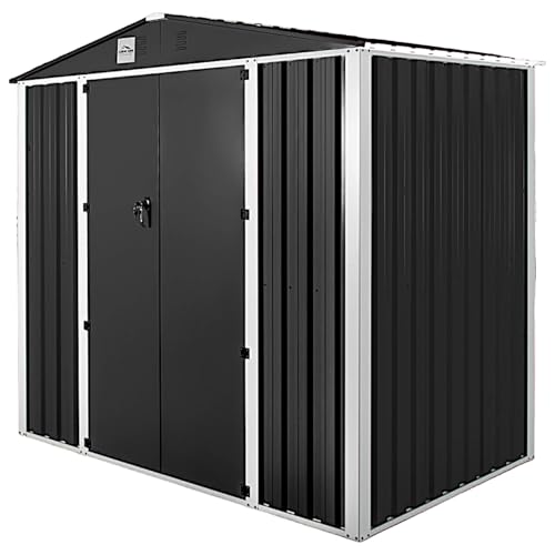 シェッドワールドの大型メタルシェッドは、幅195cm、奥行123cm、高さ185cmの屋外倉庫で、ダークグレーのスタイリッシュなデザイン。鍵付きの観音開きで、安全性も確保。法人宛や営業所止め限定での配送。