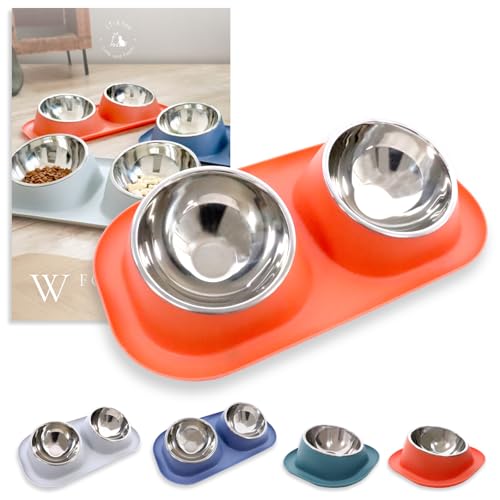 Lil&Fam 犬 猫 フードボウル 【15度の傾斜&食べこぼし防止スタンド付き】ステンレスボウル 犬 猫 ペット 餌入れ 皿 食器 餌台 ご飯台 (オレンジ, 大(ダブルボウル))の高価買取