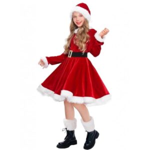 [Yavoluy] サンタ コスプレ 子供 女の子 サンタクロース 可愛い クリスマス ワンピース 帽子付き スカート サンタコス レディース 仮装 衣装 秋冬 長袖 演出服 イベント 文化祭 3点セット (140cm)