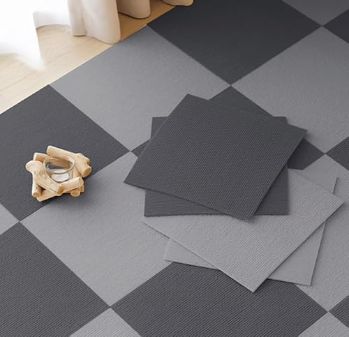 タイルカーペット 45x45cm、40枚入り。防音・滑り止め対策、洗える防污加工。ペットや子供、高齢者に最適。家庭やオフィスで使用可。カラー: ライトグレー+ダークグレー。