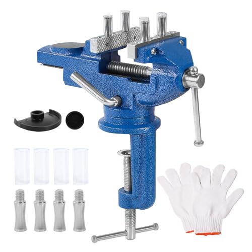 万力 卓上レギュラーアイテム挟めるクランプバイスは、小型で口幅約75mm、最大開口64mm。360°回転盤付きで鋳鋼製、しっかり固定でき細かい作業やDIYに最適な携帯用作業台です。