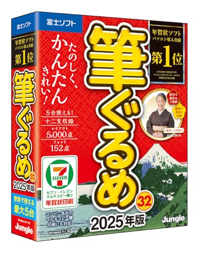 筆ぐるめ 32 2025年版は、ジャングル提供の年賀状や住所録作成、宛名印刷ソフトです。Windows対応で、パッケージ版にはDVD-ROMが含まれています。