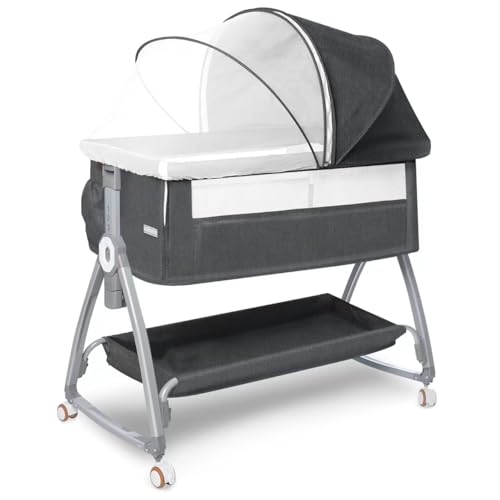 新型ベビーベッドは5in1で、高さ6段調節可能。折りたたみ式で、キャスター付きで移動も簡単。通気性のあるデザインで、洗濯可能なマット、収納かご付き。新生児から36ヶ月対応のコンパクトな添い寝ベッド。