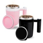 充電式自動磁気攪拌コーヒーカップ。ブラックピンクのステンレススチール製、防水設計。オフィスや旅行に最適、ミルクやココアにも対応、容量14オンス。