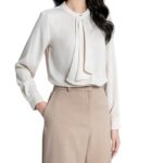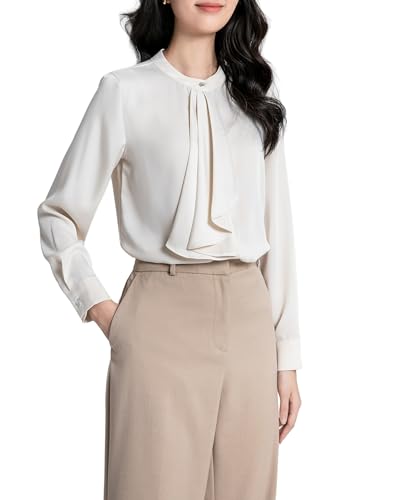 春にぴったりなシャツブラウス。サテン素材でとろみ感があり、ボウタイデザインが上品。オフィスやビジネスシーンに最適で、通勤や普段着にも使える。大きいサイズのアイボリーLです。