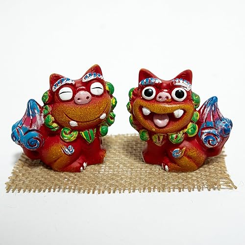 赤色シーサー ペア 置物は、沖縄の伝統的な護符で、家や商売の繁盛を願う象徴です。陶製の可愛らしいデザインで、沖縄土産としても人気があります。サイズは約15cm×10cmです。