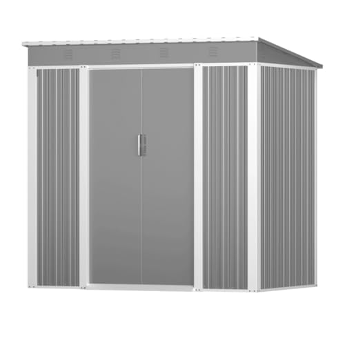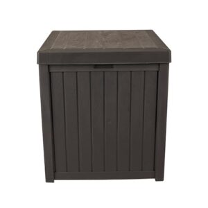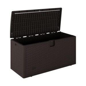 大型屋外スチール物置。幅123cm、奥行90.5cm、高さ185cm。防錆・防水設計で、ガーデニングや庭の収納に最適。おしゃれなブラウン色。