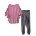 ヨガウェア上下セット(ドルマンスリーブ)。体型カバーに優れたセットアップで、スポーツウェアやフィットネスに最適。半袖トップスと杢パンツの組み合わせ。カラーはモーヴ×ロングチャコール。サイズはM。おうちヨガやピラティスにおすすめ。