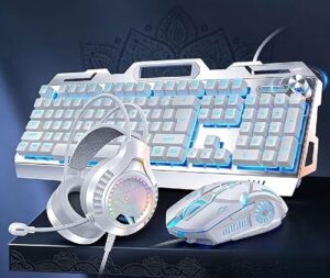 メカニカルゲーミングキーボード PC版イルミネーションキーボード ピッチ調整/輝度コントロール用ノブ、厚みのあるメタルパネル(ホワイトブルーライト、キーボード+マウス+ヘッドセット)