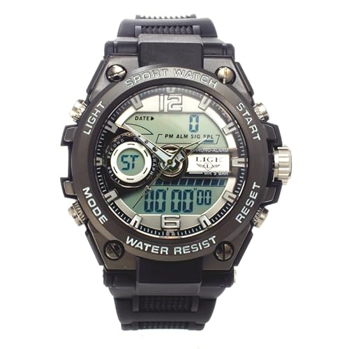 LIGE 8922 メンズ腕時計は、ガンメタとブラックのデザイン。クロノグラフ機能付きで、防水性能は5気圧。デジタルとアナログ両方の表示があり、ストップウォッチ、アラーム機能も完備。マリンスポーツやアウトドアに最適です。