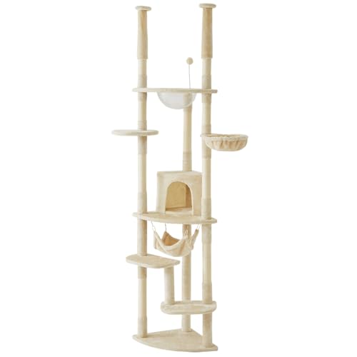 リコメン堂のキャットタワーは、高さ228~253cmで、つっぱり式の設計です。ハンモック付きで、宇宙船型の遊び場も提供しています。ベージュのデザインで、インテリアに馴染みます。
