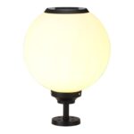 屋外用の防水ソーラーパワー門柱灯。丸型ボール型でアクリルランプシェード付き。自動点灯、設置簡単で、ガーデンフェンスやデッキ、ポーチに最適。サイズは30cm/11.8in。