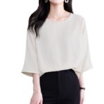 とろみブラウスは、しなやかな素材で仕立てられた七分袖のシンプルなデザインです。軽やかな着心地が特徴で、カジュアルからオフィススタイルまで幅広く活用できます。さりげない上品さを演出し、様々なボトムスとも相性抜群です。