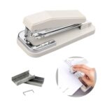 EINEYの回転式製本ステープラーは360°回転可能で、オフィスや学校での使用に最適です。業務用に調整可能で、針箱付きの灰色デザインです。
