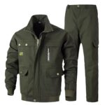 作業着上下セット。長袖シャツとカーゴパンツ、綿混素材。撥水・防汚・吸汗・速乾・軽量・通気性が特徴。165-190CM用で、庭・畑・工事現場に最適。