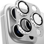 iPhone16 Pro/16 Pro Max用カメラ保護。9H強化ガラス製で耐衝撃、露出オーバー防止。アルミ合金フレーム、黒縁取り、超高透過率。シルバーカラーで全面保護を実現。