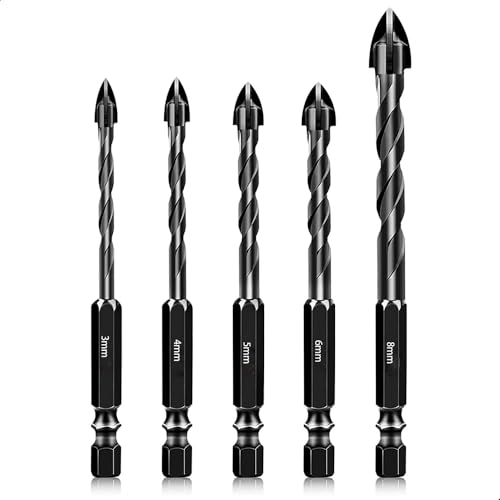 コンクリート、タイル、ガラス、陶器用の超硬刃ドリルビット5個セット。サイズは8mm、6mm、5mm、4mm、3mmで、六角軸仕様。電動ドリルに対応し、鋳物の穴あけに最適なツールキットです。