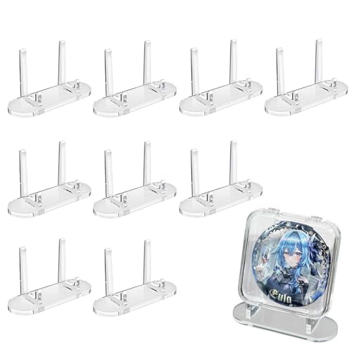 ディスプレイスタンド10個セット。アクリル製の透明陳列棚で、コレクションやカード、メダルの展示に最適。卓上用で缶バッジやコイン、小物の収納にも対応。