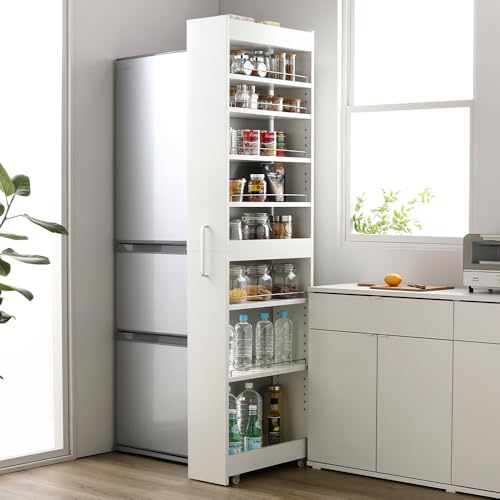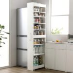RASIKのスリムキッチンワゴンは幅20cm、奥行55.4cmのハイタイプ収納ラックです。ホワイトのデザインで、キャスター付きなので洗面所や冷蔵庫横にぴったり。組み立て式のStyno スティノ製品です。