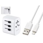 エレコムのLightningケーブルセットは、海外対応の変換プラグA/BF/O/CタイプにUSB Type-C×1とUSB-A×2を搭載。N極対応で15W出力。Apple認証の1m Lightningケーブル付き。ホワイト。