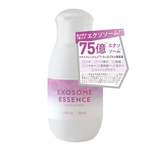ソアソームエクソソームエッセンスは、ナイアシンアミドや脂肪幹細胞を高含有し、ハリや弾力を与える美容液。べたつかず低刺激で、毛穴や目元に最適なナノカプセル処方。30ml。