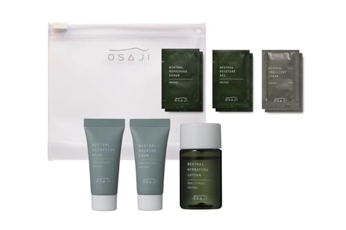 オサジのニュートラルスキンケアトライアルセットは、スキンケア5点とポーチ付きの無香料タイプです。全6種が試せるお得なセットで、敏感肌にも優しい処方です。