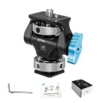 DF DIGITALFOTOのカメラモニターマウントは、ARRIスタイルで左右360度回転、前後180度調節可能。耐荷重4.5kgで、5インチ&7インチのフィールドモニターに対応。
