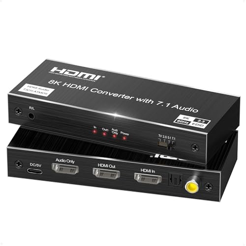 8K HDMI 2.1音声分離器は4K@120Hzに対応し、HDCP2.3、HDR10、VRRをサポート。オーディオ出力は、光デジタル、同軸、L/Rに対応。ARC非対応で、7.1CHはソース機器依存。
