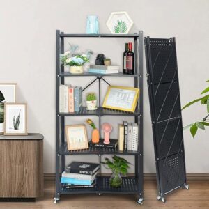 スチールラック 組み立て不要 幅71×奥行34×高さ162cm 折りたたみラック キャスター付き ABOUTHOME 収納ラック 折り畳み スチールラック本体 キッチン収納 折りたたみ 移動便利 防サビ加工 (5段 ブラック)