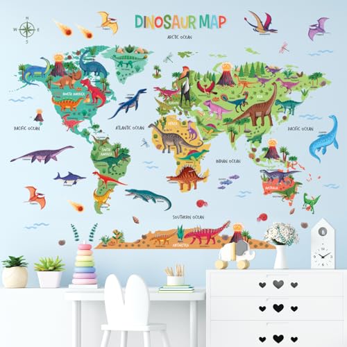 DECOWALL DL3-2415特大恐竜世界地図ウォールステッカー。サイズ151x106cm。幼稚園や子供部屋のDIYデコレーションに最適。男女問わず楽しめるデザインで、バスルームやリビングにもぴったり。