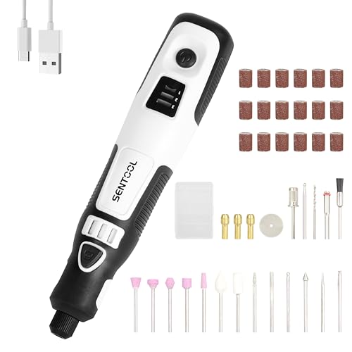 SENTOOL リューター TRL37は3.7VのUSB Type-C充電式ミニルーターで、軽量設計。3段階変速対応で、彫刻・穴あけ・研磨・切断・汚れ落としに最適。ビット40点セット付きで幅広い用途に対応。