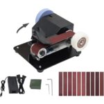 INTBUYINGの小型電動ベルトサンダーは、卓上使用可能で多機能。0-10000rpmのスピード設定と7段階の変速、正逆回転モードが特徴。DIY研磨に最適で、ベルト付き。