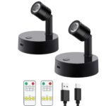 USB充電式のLEDスポットライト。リモコン付きで角度調節可能。バッテリー駆動で屋内のショーケースや天井、壁掛け照明に最適。電球色(B)の暖かい光を提供。