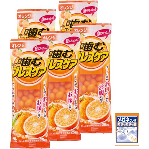 ブレスケアの噛む息リフレッシュグミは、オレンジ風味のスナックタイプの製品で、25粒入りが5個セットでおまけ付きです。食べることで手軽に口臭予防ができ、サッパリした香りを楽しめます。