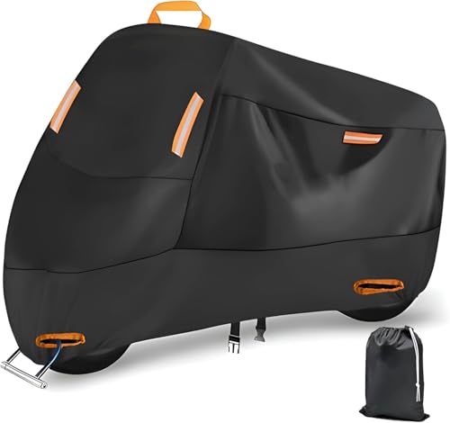 300D厚手の大型バイクカバーは全天候型で防水・耐熱・UVカット機能を備えています。反射ストリップ付き、盗難防止用ロック穴有り。防風・防埃・防雨・防雪効果もあり、収納バッグ付きで便利です。