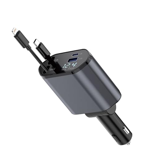 MAXWINカーチャージャーPCA37は、QC3.0およびPD対応で急速充電が可能。4台同時充電でき、巻き取り式ケーブル(USB Type-C/ライトニング)搭載。電圧測定機能付き。