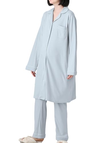 ANGELIEBEのマタニティ前開き長袖パジャマは、綿混素材でやわらかいスムース感が特徴。上下セットで、入院着や妊婦の出産準備に最適。サイズはS、色はサックスです。
