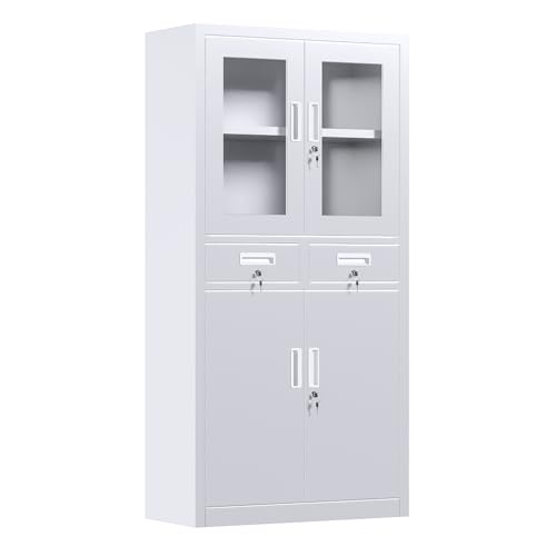 GangMeiスチール書庫 スチールキャビネット 強化ガラス 両開き 書類保管庫 引き出し 鍵付き スペアキー付き 可動棚付き A4サイズ収納 オフィス 業務用 ホワイトの製品情報