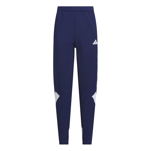 アディダスのユニセックス子供用トラックパンツ。ダークブルー/ホワイトでシンプルかつスタイリッシュ。快適な着心地と動きやすさを兼ね備えたマストハブアイテム。サイズ140。